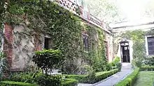 The museum consists of the house that Trotsky lived in, the garden area and the outer walls with guard facilities, located in a quiet, residential neighborhood next to an arroyo that ran parallel to the Churubusco River.[2][10] La Jornada newspaper called the atmosphere of the place “real, tense, not with abundance and not always happy.”[11] The complex was declared a historic monument in 1982.[4] The house is small and common for a dwelling built in the early 20th century in the area. One notable exception is a tower topped by a bronze eagle of the type that Venustiano Carranza used during the Mexican Revolution. It is claimed that it was a gift from Carranza to the house's former owner, a Mister Turatti. Bullet holes from the Siqueiros attack are still on the outer walls.[5] The interior of the house has been kept as it was when Trotsky lived there: the kitchen has its pots and pans, shoes are lined alongside beds, with floors and beds covered by Mexican textiles. There are some bullet holes in the interior as well. The center of the house is Trotsky's study were everything from his glasses, to papers, to books and more are left exactly as they were when Trotsky was attacked.[2][4][5]