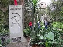 The rest of the complex space is taken up by the garden area, which is still maintained with tropical flowers and other plants, such as rare cacti, which Trotsky collected. There are photos in the museum of Trotsky collecting cacti in the Mexican countryside and tending the garden along with the rabbits and chickens which were in the hutches and coops that still exist.[2] The center of the garden contain a stone stele designed by Juan O’Gorman, which contains Trotsky's ashes along with those of his wife. Above the stele is a flagpole with the Soviet flag.[2][4]
