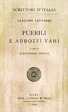 - ↑ "Crestomazia italiana poetica, cioè scelta di luoghi in verso italiano insigni o per sentimento o per locuzione, raccolti, e distribuiti secondo i tempi degli autori dal conte Giacomo Leopardi by LEOPARDI, Giacomo (1798-1837): Molto buono (Very Good) (1828) | Libreria Alberto Govi di F. Govi Sas". www.abebooks.com. Retrieved 14 October 2021.