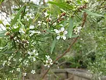 Leptospermum petersonii, commonly known as lemon-scented teatree,[2] is a species of shrub or small tree that is endemic to eastern Australia. It has thin, fibrous or flaky bark, often strongly-scented elliptic to lance-shaped leaves, white flowers and fruit that are retained for several years. It is commonly grown as an ornamental and is regarded as a minor environmental weed in some areas.