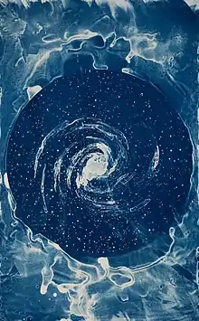The cyanotypes are created through a scientific and experimental process, by painting the images on semitransparent drafting film. Next, they are pressed on paper glazed with light-sensitive emulsion and exposed to the sun, creating a positive image. This process mimics that of the Harvard Computer's astronomical plates, essentially creating a photographic print without the use of a camera. Stepping away from the often formulaic process of science, Halloran's pieces do not dwell in accuracy, but instead offers an active experience, re-igniting the spirit of the universe.[16][17][18]