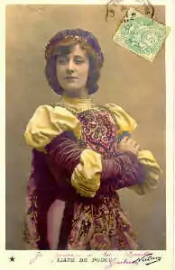 After moving to Paris, from her position at the Folies she became a noted demimondaine, and a rival of "La Belle Otero". She took her last name from one of her paramours, a Comte or Vicomte de Pougy, whilst other lovers included Mathilde de Morny and Émilienne d'Alençon. Actress Sarah Bernhardt, faced with the task of teaching Liane to act, advised her that when she was on stage, it would be best to keep her "pretty mouth shut". Liane became so well known as a performer at the Folies Bergère that the 1890s English female impersonator Herbert Charles Pollitt referenced her in his drag name Diane de Rougy.[2][3]