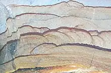 Liesegang rings (/ˈliːzəɡɑːŋ/) (also called Liesegangen rings or Liesegang bands) are colored bands of cement observed in sedimentary rocks that typically cut across bedding.[1][2] These secondary (diagenetic) sedimentary structures exhibit bands of (authigenic) minerals that are arranged in a regular repeating pattern.[3] Liesegang rings are distinguishable from other sedimentary structures by their concentric or ring-like appearance. The precise mechanism from which Liesegang rings form is not entirely known and is still under research,[4] but there is a precipitation process that is thought to be the catalyst for Liesegang ring formation, referred to as the Ostwald-Liesegang supersaturation-nucleation-depletion cycle.[5] Though Liesegang rings are considered a frequent occurrence in sedimentary rocks,[6] rings composed of iron oxide can also occur in permeable igneous and metamorphic rocks that have been chemically weathered.[7]