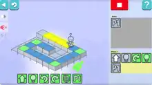 The goal of Lightbot is to command a little robot to navigate a maze and turn on lights.[6] Players arrange symbols on the screen to command the robot to walk, turn, jump, switch on a light and so on. The maze and the list of symbols become more complicated as the lessons progress.[6] While using such commands, players learn programming concepts like loops, procedures and more, without entering code in any programming language.[6]