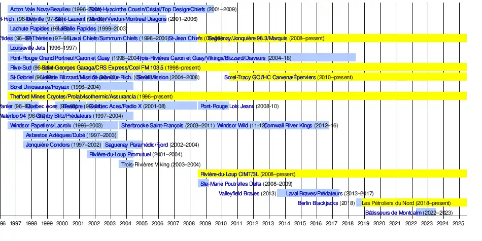 Bâtisseurs de MontcalmBerlin BlackjacksLaval PredatorsValleyfield BravesSainte-Marie Poutrelles DeltaRivière-du-Loup 3LRivière-du-Loup PromutuelSaguenay Fjord (hockey)Jonquière CondorsAsbestos AztèquesCornwall River KingsWindsor WildSherbrooke Saint-FrançoisSherbrooke Saint-FrançoisGranby Prédateurs (LNAH)Waterloo 94Pont-Rouge Lois JeansPont Rouge Lois JeansPont Rouge Lois JeansPont Rouge Lois JeansPont Rouge Lois JeansThetford AssuranciaSorel RoyauxSorel-Tracy HawksSorel-Tracy HawksSorel-Tracy HawksSorel-Tracy HawksSorel-Tracy HawksSaint-Georges Cool FM 103.5Rive-Sud ChacalsTrois-Rivières Draveurs (LNAH)Trois-Rivières BlizzardLouiseville JetsSaguenay MarquisSt-Jean ChiefsLaval ChiefsSainte-Thérèse ChiefsLaurentides GladiateursVerdun DragonsSaint-Laurent DragonsIberville DragonsHaut-Richelieu DragonsSaint-Hyacinthe ChiefsSaint-Hyacinthe Chiefs