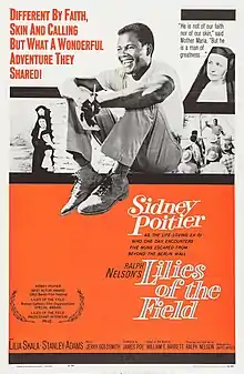 Lilies of the Field is a 1963 American comedy-drama film adapted by James Poe from the 1962 novel of the same name by William Edmund Barrett, and stars Sidney Poitier, Lilia Skala, Stanley Adams, and Dan Frazer. It was produced and directed by Ralph Nelson. The title comes from the Sermon on the Mount in the Bible (Matthew 6:27–33 and its parallel scripture from Luke 12:27–31). It features an early film score by prolific composer Jerry Goldsmith.[4] The film was turned into a Broadway musical in 1970, retitled Look to the Lilies, with Shirley Booth in the role of Mother Maria Marthe.