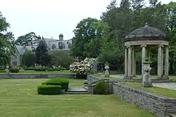 Also on the property is a Tudor style, half timber farm complex. The property also has a contributing formal garden designed by Charles Wellford Leavitt (1871–1928), garage, and greenhouse.[5] The gardens feature boxwood shaped to resemble a sundial and is scattered with urns and stone temples.[4] Plantings in the gardens featured tulips, azaleas, mountain laurels, magnolias and Japanese cherry trees. Large, multi-tiered fountains were imported from Venice but the water to the fountains were turned off after the property became a school.[6]
