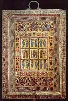 The Limburg Staurotheke (from Greek σταυρός stauros, "cross" and θήκη theke "container") is an example of a Byzantine reliquary, one of the best surviving examples of Byzantine enamel, in the cloisonné technique. It was made sometime in the mid to late 10th century in Constantinople. The box measures 48 cm (19 in) by 38 cm (15 in) and has a depth of 6 cm (2.4 in). This reliquary design was common in Byzantium beginning in the 9th century.[1] It was probably brought to Germany as loot from the Fourth Crusade, and is now in the diocesan museum of Limburg an der Lahn in Hesse, Germany.