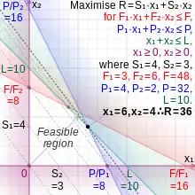 Suppose that a farmer has a piece of farm land, say L km2, to be planted with either wheat or barley or some combination of the two. The farmer has a limited amount of fertilizer, F kilograms, and pesticide, P kilograms. Every square kilometer of wheat requires F1 kilograms of fertilizer and P1 kilograms of pesticide, while every square kilometer of barley requires F2 kilograms of fertilizer and P2 kilograms of pesticide. Let S1 be the selling price of wheat per square kilometer, and S2 be the selling price of barley. If we denote the area of land planted with wheat and barley by x1 and x2 respectively, then profit can be maximized by choosing optimal values for x1 and x2. This problem can be expressed with the following linear programming problem in the standard form:
