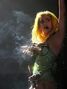 The design team for the series conceived eighteen outfits to complement Gaga's outré and eccentric reputation, although they did not collaborate with any of Gaga's stylists or creative director Nicola Formichetti.[8] Due to the outfits' unconventional appearances, Jean was given more freedom to animate the large array of costumes, as these rapid changes "wouldn't be possible in real life".[5] "There's a moment in the episode," Jean resumed, "when she starts out with her hair down. Then, there's a curtain pulled in front of her, and in seconds, she has a completely different outfit on with a cone bra and her hair is all hairsprayed up and big and frizzy. In real life, that would probably take 8 hours."[5] Many of the costumes were inspired from previous outfits Gaga had worn, including her meat dress and her Kermit the Frog dress. "We did a lot of research, looking back at her old outfits, and she's really been in a million different things, had a million different looks."[5]