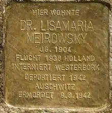 In 1938, persecuted as a "non-Aryan" despite her conversion, Meirowsky went to Utrecht in the Netherlands with the Dominican Fr. Stratmann. In October 1941 she went into hiding in the Trappist Abbey of Our Lady of Koningsoord near Tilburg, where she worked as a doctor and porter. On July 26, 1942, the Archbishop of Utrecht, Jan de Jong, had a pastoral letter read out against the Germans' actions against the Jews. In response, on August 2, 1942, 244 former Jews who had converted to Catholicism, among them Lisamaria Meirowsky and the siblings Edith and Rosa Stein,[4] were arrested by the Gestapo and deported to the Westerbork concentration camp, probably on August 4, 1942. From there they were taken to the Auschwitz concentration camp on August 7, 1942, and murdered on August 9.[3][5]