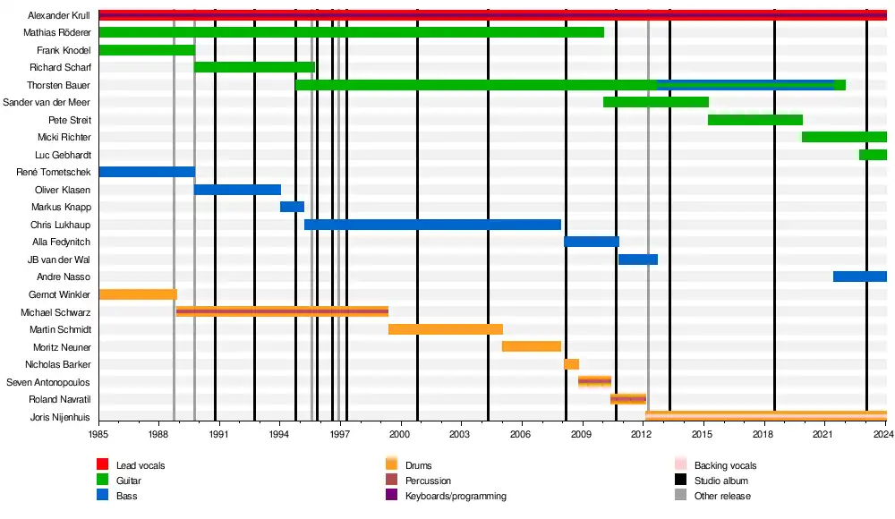 Pete Streit replaced van der Meer in September 2015, after several months filling in for the former guitarist.[17] He performed on 2018's Okkult II, before leaving for "private reasons" in November 2019 to be replaced by Micki Richter.[18] In June 2021, the band returned to a five-member setup for the first time since 2013 with the addition of Andre Nasso on bass.[19] At the end of the year, Atrocity announced that Bauer would be leaving the band after more than 25 years in the lineup, with the guitarist and bassist writing in a statement that "I feel that now is the right time for me to ... look forward to and embrace new things and challenges in my life."[20] Bauer was not replaced until September 2022, when Luc Gebhardt took his place.[21]