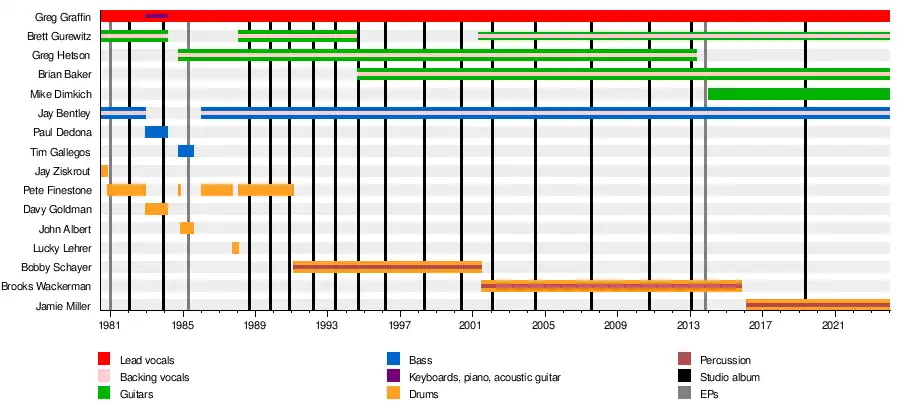 Bentley and later Gurewitz returned to Bad Religion in 1986, with the five-piece lineup releasing three albums in three years before Finestone left again in 1991.[2] He was replaced by Bobby Schayer, whose first album with the band was Generator in 1992.[2] After Bad Religion signed to Atlantic Records and released Stranger than Fiction in 1994, Gurewitz left the band again.[3] Shortly after the album's release, Brian Baker took Gurewitz's place in the group.[4] After three more albums, Schayer departed the band in 2001 due to a shoulder injury, and was replaced by Brooks Wackerman.[5] Around the same time, Gurewitz returned to the band for a third time.[6] Longtime guitarist Hetson left in 2013 and was replaced by Mike Dimkich,[7] and in 2016 Jamie Miller replaced Wackerman after he joined Avenged Sevenfold.[8]