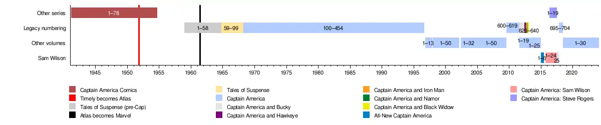 - Captain America Comics #1–73 (Timely Comics; March 1941 – July 1949)