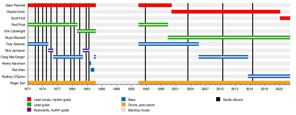 | "Lonesome" Dave Peverett | 1990–1993 (died 2000)[6] |