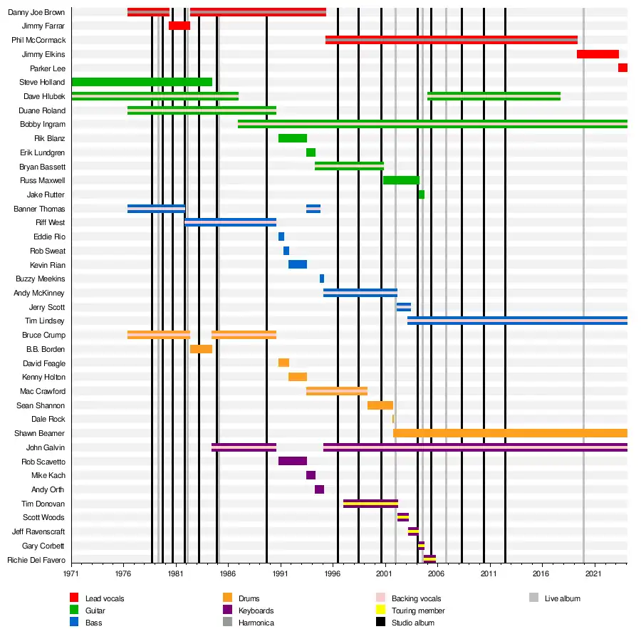 | Tony Mikus | 2022 (touring substitute) | vocals | Mikus filled in for Jimmy Elkins in 2022.[38] |