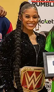 Two-time and longest-reigning champion Bianca Belair; her first reign lasted 420 days (419 as recognized by WWE). Her second reign is also the shortest reign at 1 minute and 35 seconds.
