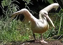 Bustards are large terrestrial birds mainly associated with dry open country and steppes in the Old World. They are omnivorous and nest on the ground. They walk steadily on strong legs and big toes, pecking for food as they go. They have long broad wings with "fingered" wingtips and striking patterns in flight. Many have interesting mating displays.