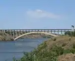 ![]() | 5 | Zaporizhzhia Bridge | Міст у Запоріжжі | 234 m (768 ft) | 389 m (1,276 ft) | Arch 2 levels concrete deck arch | 1952 | Zaporizhzhia 47°49′14.0″N 35°04′29.9″E / 47.820556°N 35.074972°E | Zaporizhzhia | [S 7] [3] [4] | |