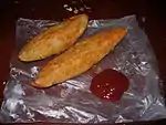 | Pakora | ![]() | India | It is created by taking one or two ingredients such as onion, eggplant, potato, spinach, plantain, paneer, cauliflower, tomato, chili pepper, or occasionally bread[16] or chicken and dipping them in a batter of gram flour and then deep-frying them. The most popular varieties are palak pakora, made from spinach, paneer pakora, made from paneer (soft cheese), pyaz pakora, made from onion, and aloo pakora, made from potato. |