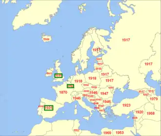 Dates of the latest abolitions of monarchies in Europe and the territories nearby. A green rectangle indicates that the monarchy was restored afterwards and is currently functioning. If a country has no date, it means that either it has never had a monarchical government (e.g. Switzerland) or it has been functioning throughout the country's modern history (e.g. Sweden, Denmark and Norway). Note that the dates do not necessarily mark the end of the national independent monarchy but the territory it covered (e.g. Ukraine).