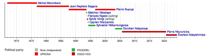 This article lists the presidents of Burundi since the formation of the post of President of Burundi in 1966 (following the November coup d'état), to the present day.