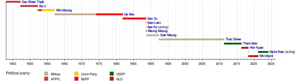2 March 1962 | 2 March 1974 | 12 years | Military / Burma Socialist Programme Party |