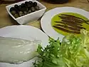 | Kuai | China | Finely cut strips of raw fish or meat, which was popular and commonly eaten in the early history and dynastic times of China. According to the Book of Rites compiled between 202 BCE–220 CE, kuai consists of small thin slices or strips of raw meat, which are prepared by first thinly slicing the meat and then cutting the thin slices into strips. In modern times, the dishes are more often referred to as "raw fish slices". Commonly used fish in ancient times include carp and mandarin fish, but salmon is also used in modern times. Sauces were an essential part of kuai dishes, with green onions used for preparation of sauces in spring and mustard seed used for sauces in autumn. According to many classical texts, kuai served without sauces was deemed inedible and should be avoided.[2] | |