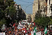 Demonstration in Sevilla, Spain during the 14 November 2012 general strike. Flags of the Confederación General del Trabajo (CGT) and the Andalusian Workers' Union (SAT) are seen.