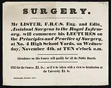 In September 1854, Lister's house surgeoncy appointment was finished.[107] With the prospect of being out of a job, he had spoken to his father about seeking a position at the Royal Free Hospital in London.[107] However, Sharpey had written to Syme, warning him that it was unlikely that Lister would be welcome at the Royal Free as he would have likely eclipsed Thomas H. Wakley, whose father held considerable sway at the hospital.[108] Lister then planned to tour Europe for a year.[109] However an opportunity presented itself, when the noted infirmary surgeon and surgical lecturer at the Edinburgh Extramural School of Medicine Richard James Mackenzie had died.[110] Mackenzie had been seen as a successor to Syme[110] but had contracted cholera in Balbec in Scutari, Istanbul, while on a four-month volunteer sabbatical as field surgeon to the 79th Highlanders during the Crimean War.[30] Lister took advantage of the situation and proposed to Syme that he take over Mackenzie's position to become assistant surgeon to Syme.[109] Syme initially rejected the idea as Lister was not licensed to operate in Scotland, but later warmed to the idea.[109] In October 1854, Lister was appointed a lecturer[111] Lister successfully transferred the lease held by Mackenzie at his lecture room at 4 High School Yards, to himself. On 21 April 1855, Lister was elected a Fellow of the Royal College of Surgeons of Edinburgh[112] and two days later, rented a house at 3 Rutland Square for living.[30] In June 1855, Lister made a hurried trip to Paris to take a course on operative surgery on the dead body and returned in June.[112]