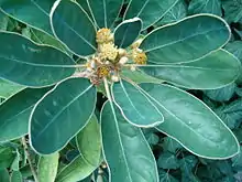 They are typically dioecious trees or shrubs. The leaves can be either deciduous or evergreen depending on species, and aromatic. They have leaves alternate or opposite or in whorls.[2] The inconspicuous flowers range from greenish to white, greenish-yellow, to yellowish. The inflorescences are pseudo-umbels, flat-topped or rounded flower clusters, each pseudo-umbel with an involucre of four or six decussate bracts.[2]