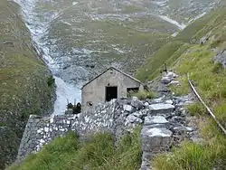 The monorail was projected in 1922 by the English engineer Charles Denham, owner of the quarry of Piastreta.[1] The line, used to carry the marble from the quarry to the valley, consisted of a single rail on wooden sleepers, on which a motorized tractor hauled a sled load. The system of the sleds was already used, for the transport of marble, also in other vie di lizza (i.e. "routes of contention"),[2] on other trials used for the lizzatura.[3] This was the only plant of its kind to be built, and the track was realized in the workshops of Sesto San Giovanni, near Milan.[4]