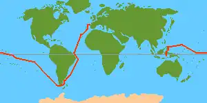 The fleet headed southwest to the Canary Islands and then south along the African coastline.[3] In November 1525 de Loaísa moved west across the Atlantic to Brazil, reaching the Patagonian shore in January 1526.[3] There was no sign of Trinidad, and de Loaísa decided to abandon the search for her and continue instead to the Spice Islands. However the weather was poor, and over the next several weeks, in high winds while trying to enter the Strait of Magellan, the ships alternately gathered and dispersed. Two ships, Sancti Spiritus and Anunciada were wrecked, and one, San Gabriel tacked into the Atlantic and deserted the expedition.