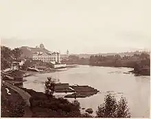 Felled logs are then generally transported to a sawmill to be cut into lumber, to a paper mill for paper pulp, or for other uses, for example, as fence posts. Many methods have been used to move logs from where they were cut to a rail line or directly to a sawmill or paper mill. The cheapest and historically most common method is making use of a river's current to float floating tree trunks downstream, by either log driving or timber rafting. (Some logs sink because of high resin content; these are called deadheads.) In the late 1800s and the first half of the 1900s, the most common method was the high-wheel loader, which was a set of wheels over ten feet tall that the log or logs were strapped beneath. Oxen were at first used with the high-wheel loaders,but in the 1930s tractors replaced the oxen.[12] In 1960 the largest high wheel loader was built for service in California. Called the Bunyan Buggie, the unit was self-propelled and had wheels 24 feet (7.3 m) high and a front dozer blade that was 30 feet (9.1 m) across and 6 feet (1.8 m) high.[13] Log transportation can be challenging and costly since trees are often far from roads or watercourses. Road building and maintenance may be restricted in National Forests or other wilderness areas since it can cause erosion in riparian zones. When felled logs sit adjacent to a road, heavy machinery may simply lift logs onto trucks. Most often, special heavy equipment is used to gather the logs from the site and move them close to the road to be lifted on trucks. Many methods exist to transport felled logs lying away from roads. Cable logging involves a yarder, which pulls one or several logs along the ground to a platform where a truck is waiting. When the terrain is too uneven to pull logs on the ground, a skyline can lift logs off the ground vertically, similar to a ski lift. Heli-logging, which uses heavy-lift helicopters to remove cut trees from forests by lifting them on cables attached to a helicopter, may be used when cable logging is not allowed for environmental reasons or when roads are lacking. It reduces the level of infrastructure required to log in a specific location, reducing the environmental impact of logging.[14] Less mainstream or now for the most part superseded forms of log transport include horse logging and the use of oxen,[15] or balloon logging.