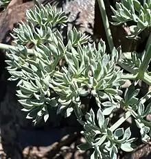 Plants are small, usually less than 20 cm (8 inches) tall. Foliage has a blue-gray to green color, and is held on thick fleshy stalks. Leaves are fleshy and are dissected into leaflets that have a sharp extended tip, referred to by the species name cuspidatum.[3] Flowers appear early in the growth season (May to June) and are held above the foliage in a compound umbel on thick fleshy stalks that arise from the base of the plant. The flowers are brownish purple to brownish red in color.[3]