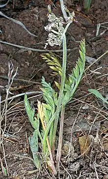 Lomatium orientale, commonly known as salt-and-pepper,[2] eastern cous, eastern desert-parsley, eastern lomatium, white-flowered desert-parsley, oriental desert parsley[3] or Northern Idaho biscuitroot,[4] is a small spring blooming ephemeral plant. It grows in open habitats from the plains to foothills in western North America. It is known as one of the earliest blooming native flowers in its habitat. The species name, "orientale", is botanical Latin meaning "eastern".[5]