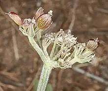 The many flowers of Lomatium orientale grow together in a rounded head called an umbel. This umbrella shaped inflorescence is a compound umbel because each is formed out of three to fifteen smaller smaller umbels called umbelets.[6] Each umbelet will have about 20 tiny flowers.[9] The small stems that support the flower are 1.2–5.5 cm long. Each flower has five tiny petals, which are white to pinkish in color with prominent dark red anthers.[7][2] The lack of red anthers in on the flowers of Cymopterus montanus help to distinguish between them.[7] The rounded ovary under the flower is glabrous, free of hairs.[9] This is an important characteristic to distinguish it from the very similar species such as Lomatium nevadense where their range overlaps New Mexico, Utah, or Arizona.[8]