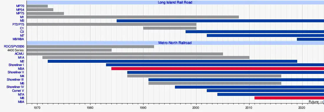 One of the most popular decisions by Governor Nelson A. Rockefeller after the 1966 takeover was replacing the entire electric passenger fleet with M1 cars.[4] It acquired 770 M1 cars built by Budd and General Electric from 1968 to 1974, and 174 M3 cars, built in 1985 and 1986, also by the Budd Company.[5][6]