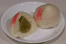 A longevity peach, or shoutao, is a type of lotus seed bun, sometimes with a filling made of red bean paste or lotus paste. It is white with a red dyed tip with a crease along the side, mimicking the shape of a peach. Occasionally, bakers add green decorations that mimic leaves.[1] The longevity peach is a representation of Peaches of Immortality. According to Chinese folk legends, these peaches ripen every thousands of years, and grant immortality to humans when consumed.[2]