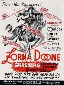 Lorna Doone is a 1934 British historical drama film directed by Basil Dean and starring Victoria Hopper, John Loder and Margaret Lockwood.[1] It is based on the 1869 novel Lorna Doone by R. D. Blackmore. This was the third screen version of the novel, and the first with sound; a further cinema adaptation followed in 1951.[2]