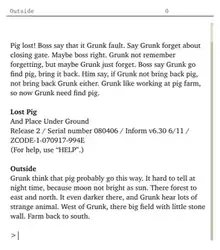 As interactive fiction, the player types English commands into the game and the game responds in English. However, the protagonist, Grunk, speaks broken English.[5] This means that the game's responses are frequently in broken English. A reviewer for The Onion A.V. Club notes that the broken English is "clever but never too cute" and that "[Grunk's] observations make a certain sense—and his matter-of-fact reporting has an awesome clarity...."[5]