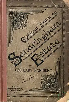 In 1887 she published "Eighteen Years on Sandringham Estate" with the nom-de-plume of "The Lady Farmer".[5] The book is a useful description of the life of a woman running a large estate and her disputes. Later commentators point out that the book was written in retribution and some of the facts like dates are misreported.[3] In 1896 her former home at Sandringham, Appleton, was given to Maud of Wales and the future King Haakon VII as a wedding present by Edward VII.[2]