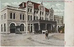 Louisville and Nashville Railroad Station, also known as L & N Station, was a historic train station located in downtown Evansville, Indiana. It was built in 1902 for the Louisville and Nashville Railroad, and was a Richardsonian Romanesque style rock-faced limestone building. It consisted of a three-story central block with two-story flanking wings, and a one-story baggage wing. It had projecting gabled pavilions and a slate hipped roof.[2]: 2