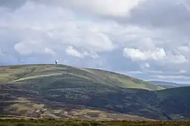 Lowther Hill is a hill in the Lowther Hills range, part of the Southern Uplands of Scotland. Although the hill lends its name to the range, it is the second highest point of the Lowther Hills and lies on the border between Lanarkshire and Dumfries and Galloway, east of the town of Sanquhar, however the true summit lies just within Lanarkshire. The hill can be seen from a great distance in almost every direction throughout the central Southern Uplands when at height, in part due to its summit being topped by a radar station owned by NATS, the radome being colloquially known as "the golf ball".[4] Access to the station is via a private service road starting in Wanlockhead, the highest village in Scotland.[5] Although motor vehicle access is restricted, the road is popular with hillwalkers and cyclists, using it as a means of easy access to the top of the hill or for recreation. Continuing on to the highest of the range, Green Lowther, it is the second highest paved road in Britain and the highest in Scotland.[6] Lowther Hill is also the highest point of the 344 km Southern Upland Way, passing just short of the summit at around 710m.[7]