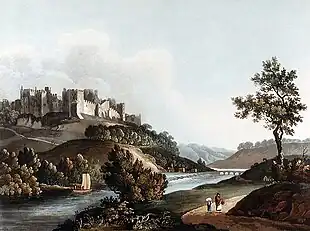 The town of Ludlow was increasingly fashionable and frequented by tourists, with the castle forming a particularly popular attraction.[116] Thomas Warton published an edition of Milton's poems in 1785, describing Ludlow Castle and popularising the links to Comus, reinforcing the castle's reputation as a picturesque and sublime location.[117] The castle became a topic for painters interested in these themes: J. M. W. Turner, Francis Towne, Thomas Hearne, Julius Ibbetson, Peter de Wint and William Marlowe all produced depictions of the castle during the late 18th and early 19th centuries, usually taking some artistic licence with the details in order to produce atmospheric works.[118]