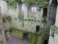 Walter de Lacy travelled to Ireland in 1201 and the following year his properties, including Ludlow Castle, were once again confiscated to ensure his loyalty and placed under the control of William de Braose, his father-in-law.[26] Walter's lands were returned to him, subject to the payment of a fine of 400 marks, but in 1207 his disagreements with royal officials in Ireland led to King John seizing the castle and putting it under the control of William again.[27][lower-alpha 1] Walter reconciled himself with John the following year, but meanwhile William himself had fallen out with the King; violence broke out and both Walter and William took refuge in Ireland, with John taking control of Ludlow yet again.[27] It was not until 1215 that their relationship recovered and John agreed to give Ludlow back to Walter.[28] At some point during the early 13th century, the innermost bailey was constructed in the castle, creating an additional private space within the inner bailey.[29]