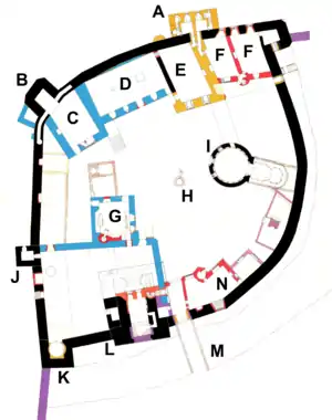 The inner bailey; locations: A – Garderobe Tower; B – North-West Tower; C – Solar block; D – Great Hall; E – Great Chamber block; F – Tudor Lodgings and North-East Tower; G – Great Kitchen and pantry; H – well; I – Chapel of St Mary Magdalene; J – West Tower; K – South-West Tower; L – Great Tower; M – ditch and bridge; N – Judges's Lodgings.