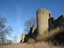 The western curtain wall is approximately 6-foot-5-inch (1.96 m) thick, and guarded by the 13th-century Mortimer's Tower, 18 feet (5.5 m) across externally, with a ground floor vaulted chamber inside, 12-foot-9.5-inch (3.899 m) large.[163] When first built, Mortimer's Tower was a three-storey gateway with an unusual D-shaped design, possibly similar to those at Trim Castle in Ireland, but in the 15th century the entrance way was blocked up to turn it into a conventional mural tower, and in the 16th century an additional internal floor was inserted.[164] The tower is now roofless, although it was roofed as late as the end of the 19th century.[165]