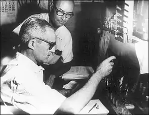 In 1945, Leloir ended his exile and returned to Argentina to work under Houssay at the Instituto de Investigaciones Bioquímicas de la Fundación Campomar, which Leloir would direct from its creation in 1947 by businessman and patron Jaime Campomar. Initially, the institute was composed of five rooms, a bathroom, central hall, patio, kitchen, and changing room.[12] During the final years of the 1940s, although lacking financial resources and operating with very low-cost teams, Leloir's successful experiments would reveal the chemical origins of sugar synthesis in yeast as well as the oxidation of fatty acids in the liver; together with J. M. Muñoz, he produced an active cell-free system, a first in scientific research. It had initially been assumed that in order to study a cell, scientists could not separate it from its host organism, as oxidation could only occur in intact cells.[13] Along the way, Muñoz and Leloir, unable to procure the costly refrigerated centrifuge needed to separate cell contents, improvised by spinning a tire stuffed with salt and ice.[12]
