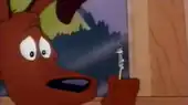 Smidgen runs into the cabin, grabs the horn and gives several blows that alert a nearby moose. The normal-sized moose happily runs after what it believes is another moose, only to find in waiting an enormous dog. The moose instantly flees, yelping like a dog. Smidgen gives the horn another blow, sending Bugs flying into the barrel of a revolver. Smidgen fires it, sending the bullet Bugs is riding on into a nearby apple in a fruit basket. Smidgen grabs the apple and takes a large bite, leaving Bugs' lower half exposed. Smidgen then eats the entire apple, grabs a toothpick to pick his teeth, and walks away, seemingly feeling assured that Bugs has been eaten and taken care of. As Smidgen picks his teeth, Bugs comes out unharmed on the top of the toothpick. Bugs then hops up, grabs Smidgen's ear, and wraps the ear around Smidgen's head, covering his eyes. Bugs dives into the hair on the back of Smidgen's neck. From there, Bugs proceeds to scratch the surface of Smidgen's skin, causing the dog to writhe in ecstasy. This gives Bugs the opportunity to run down Smidgen's leg and leave the cabin. Smidgen runs out after him.